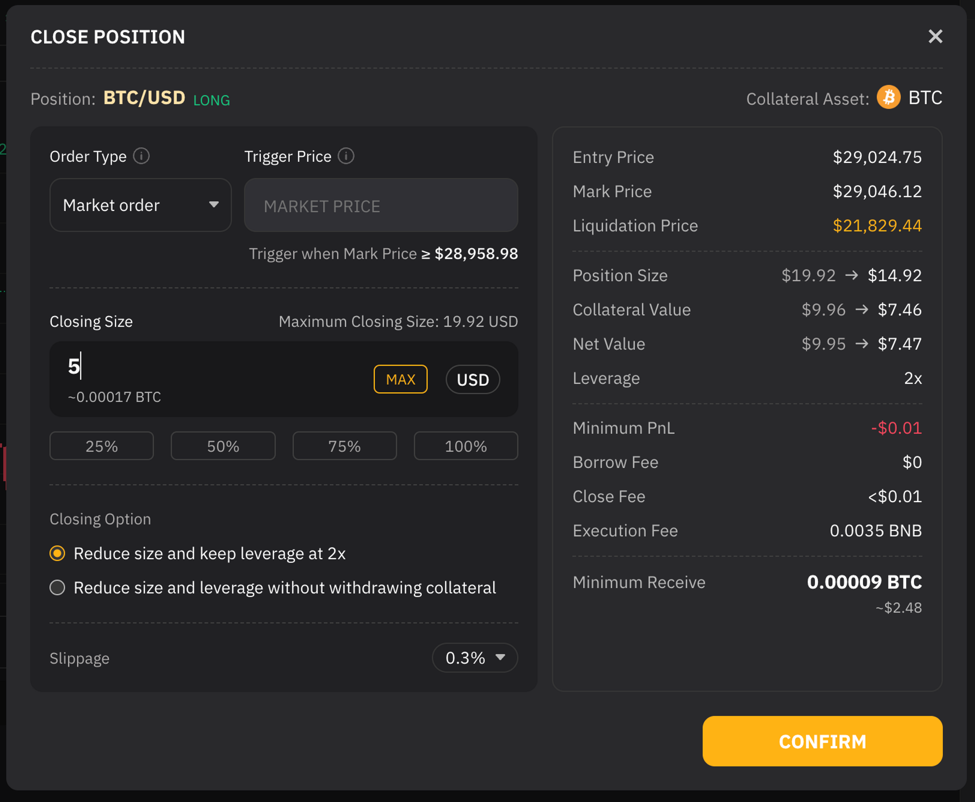 2. **Reduce size and leverage without withdrawing collateral**: collateral is kept the same whilst both the position size and leverage are reduced. The collateral will, however, take on any loss from the open position where a portion of the collateral will be deducted to cover the loss.