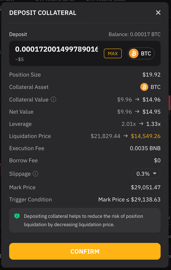 Depositing additional collateral reduces the leverage and liquidation price of a trade. The image below shows the impact of adding \~25% additional collateral to an open position.